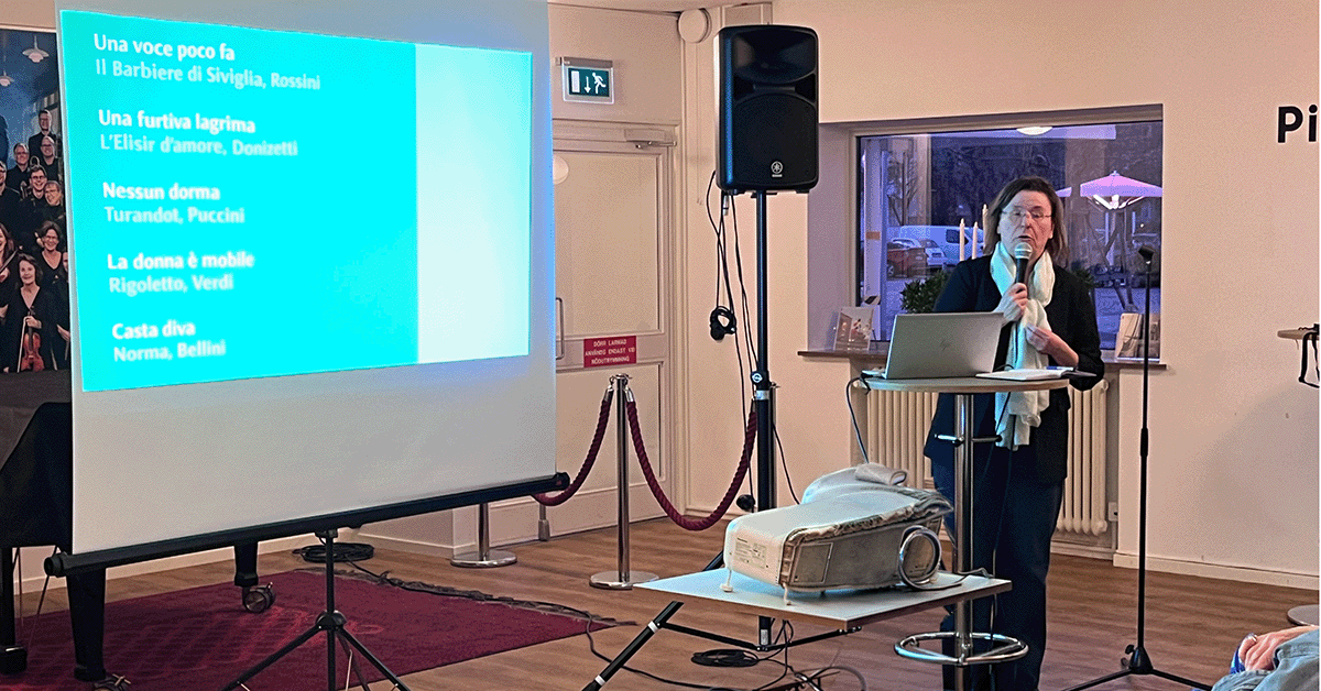 Avslutningsvis fick vi åter en dos av Italien då Benedicte förklarade betydelsen av HUR man uttalar italienska. Med fel betoning kan betydelsen bli en helt annan. När det gäller italienskan är musik och språk en enhet. Och som avslutning fick Vännerna lyssna till Luciano Pavarotti och Giuseppe di Stefano.